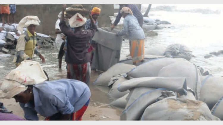 കഴിഞ്ഞ ദിവസം കളക്ടറുമായി തീരവാസികള് നടത്തിയ ചര്ച്ചയുടെ അടിസ്ഥാനത്തിലാണ് മണല് നിറക്കല് ആരംഭിച്ചത്. വേളാങ്കണ്ണി, ബസ്സാര് തീരങ്ങളിലാണ് ജിയോ ബാഗ് തടയിണ തീര്ത്ത് കടല്കയറ്റം തടയാന് ധാരണയായത്. കരാറുകാരന് നിയോഗിച്ച 15 തൊഴിലാളികളെ കൂടാതെ നൂറോളം നാട്ടുകാരും ബാഗുകളില് മണല് നിറക്കാനെത്തി.