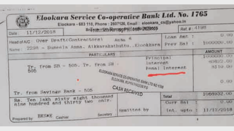 കളമശേരി: കോണ്ഗ്രസ്സ് നിയന്ത്രണത്തിലുള്ള ബാങ്ക് അമിത പലിശ വാങ്ങുന്നതായി പരാതി.വായ്പ തുക ഒറ്റത്തവണ അടച്ച് തീര്ത്തപ്പോള് പിഴ പലിശ ഈടാക്കിയ സഹകരണ ബാങ്കിന്റെ നടപടിക്കെതിരെ പരാതിയുമായി വായ്പക്കാരി രംഗത്ത്.