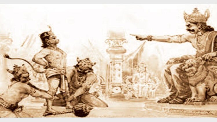 രാവണന്‍ അപ്പോഴും രാമനെ നിന്ദിച്ചു കൊണ്ടേയിരുന്നു. ‘സമന്മാര്‍ തമ്മിലാണ് സന്ദേശവും പ്രതിസന്ദേശവും കൈമാറേണ്ടത്.  രാമന്‍ നിനക്ക് സ്വാമിയായിരിക്കാം. ആ നിസ്സാരന്‍ എനിക്ക് സന്ദേശമയയ്‌ക്കുകയോ? ത്രിലോകങ്ങള്‍ക്കും ചക്രവര്‍ത്തിയായ ഞാനെന്തിന് രാമന് പ്രതിസന്ദേശമയയ്‌ക്കണം? ‘