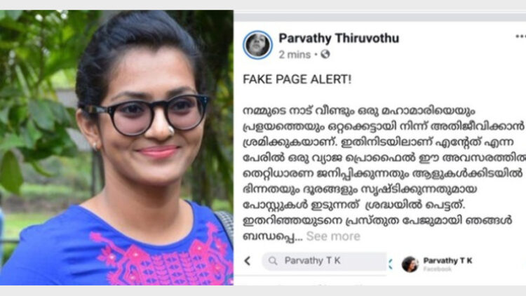 തന്റെ പേരില്‍ വ്യാജ പോസ്റ്റുകള്‍ പ്രചരിപ്പിച്ച് ജനങ്ങള്‍ക്കിടയില്‍ വീഭാഗീയത പ്രചരിപ്പിക്കുന്നതായി നടി പാര്‍വ്വതി; വ്യജ അക്കൗണ്ടിലൂടെ പ്രചരിപ്പിച്ച വാര്‍ത്ത വ്യാജം