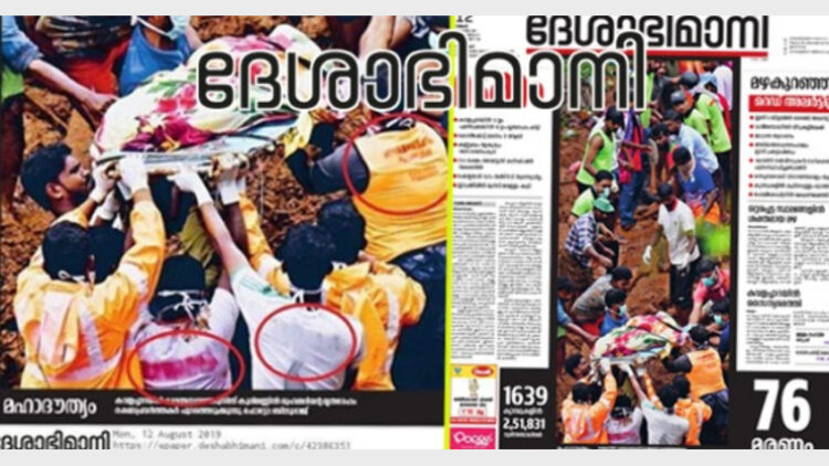 കവളപ്പാറയില് മൃതദേഹം പുറത്തെടുക്കുന്ന ഫോട്ടോയാണ് ദേശാഭിമാനി ആദ്യപേജില് ഫോട്ടോഷോപ്പ് ചെയ്ത് നല്കിയത്. മൃതദേഹം പുറത്തെടുക്കുന്ന രക്ഷാ പ്രവര്ത്തകര് സേവാഭാരതിയുടെ പേരുകള് ആലേഖനം ചെയ്ത ഷര്ട്ട് ധരിച്ചിരുന്നു. ഇതില് മുസ്ലിം ലീഗിന്റെ വെള്ള നിറമുള്ള ടീ ഷര്ട്ട് ധരിച്ച വെറ്റ് ഗാര്ഡുമാരും, എസ്ഡിപിഐയുടെ പേരുള്ള ഷര്ട്ട് ധരിച്ചവരും ആര്എസ്എസ് സേവന വിഭാഗമായ സേവാഭാരതിയുടെ കാവി ഷര്ട്ട് ധരിച്ചവരും ഉണ്ട്. ഇവരുടെ ഷര്ട്ടിലെ പേര് ഫോട്ടോഷോപ്പ് ചെയ്ത് മായ്ച്ചാണ് ദേശാഭിമാനി ഫോട്ടോ നല്കിയത്.