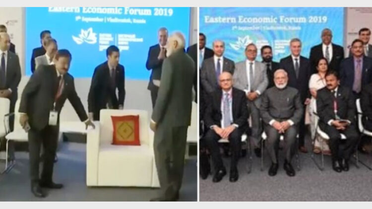 വ്ളാദിവോസ്റ്റോക് : റഷ്യയിലെ പ്രതിനിധി സമ്മേളന വേദിയിലും എളിമ കൈവിടാതെ പ്രധാനമന്ത്രി നരേന്ദ്രമോദി. വിവിധ രാജ്യങ്ങളുടെ ഉന്നത പ്രതിനിധികള് പങ്കെടുത്ത ഫോട്ടോ സെഷനില് മോദിക്ക് മാത്രം പ്രത്യേകമായി ഒരു സോഫ ഒരുക്കിയിരുന്നു. എന്നാല് എല്ലാവരുടേത് പോലെ തന്നെയുള്ള കസേര തന്നെ മതിയെന്ന് മോദി വിനയത്തോടെ ആവശ്യപ്പെടുകയായിരുന്നു.