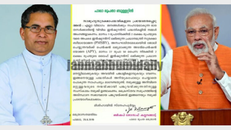 പാലാ: നരേന്ദ്ര മോദി സര്‍ക്കാരിന്റെ ജനക്ഷേമപദ്ധതികള്‍ ഏറ്റെടുത്ത് പ്രചരിപ്പിച്ച് പാലാ രൂപത. രൂപതാ മെത്രാന്‍  ബിഷപ്പ് ജോസഫ് കല്ലറങ്ങാട്ട് പുറത്തിറക്കിയ പ്രത്യേക ബുള്ളറ്റിനിലാണ് ജനങ്ങള്‍ക്ക് സഹായകമാകുന്ന കേന്ദ്ര സര്‍ക്കാര്‍ പദ്ധതികളില്‍ അംഗങ്ങളാകണമെന്ന് ആവശ്യപ്പെട്ടിരിക്കുന്നത്.