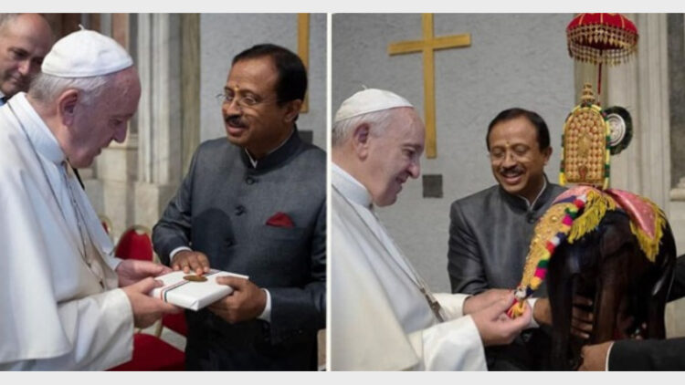 വത്തിക്കാന്: മറിയം ത്രേസ്യ ഉള്പ്പടെ അഞ്ച് പേരെ വിശുദ്ധരായി പ്രഖ്യാപിച്ചുകൊണ്ട് വത്തിക്കാനില് നടന്ന ചടങ്ങില് ഇന്ത്യയെ പ്രതിനിധീകരിച്ച് കേന്ദ്ര മന്ത്രി വി.മുരളീധരന് പങ്കെടുത്തു. ചടങ്ങിന് ശേഷം ഫ്രാന്സിസ് മാര്പ്പാപ്പയുമായി അദ്ദേഹം കൂടിക്കാഴ്ച നടത്തി. മഹാത്മാഗാന്ധിയുടെ വ്യാഖ്യാനത്തിലുള്ള ഭഗവദ് ഗീത മാര്പ്പാപ്പയ്ക്ക് സമ്മാനിച്ചു. കൂടാതെ കേരളീയ ക്ഷേത്രങ്ങളിലെ പരമ്പരാഗത രീതിയില് തിടമ്പേന്തി നെറ്റിപ്പട്ടം കെട്ടിയ ആനയുടെ രൂപവും മാര്പ്പാപ്പയ്ക്ക് സമ്മാനിച്ചു. പ്രധാനമന്ത്രി നരേന്ദ്ര മോദി മാര്പ്പാപ്പ ആശംസകള് നേര്ന്നു.