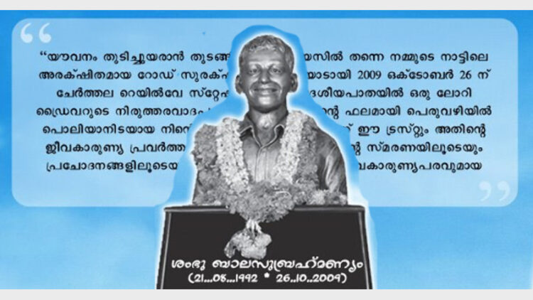 ചേര്‍ത്തല: കാര്‍ അപകടത്തില്‍ മരിച്ച ഏകമകന്റെ ഓര്‍മകള്‍ക്ക് 10 വയസ്. അപകടബോധവല്‍ക്കരണ പരിപാടികളുമായി മാതാപിതാക്കള്‍. തുറവൂര്‍ തിരുമലഭാഗം ശംഭു മെമ്മോറിയല്‍ ട്രസ്റ്റിന്റ് സ്ഥാപകരായ മാധവ ബാലസുബ്രഹ്മണ്യവും ഭാര്യ പത്മജവുമാണ് മകന്റെ മരണം ഏല്‍പ്പിച്ച ഒറ്റപ്പെടലിനെ സാമൂഹ്യസേവന പ്രവര്‍ത്തനങ്ങളിലൂടെ മറികടക്കുന്നത്.