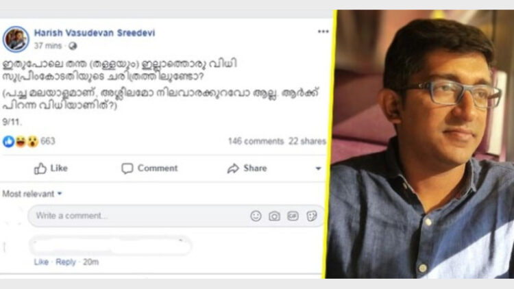 ഇതുപോലെ തന്ത(തള്ളയും) ഇല്ലാത്തൊരു വിധി സുപ്രീംകോടതിയുടെ ചരിത്രത്തിലുണ്ടോ? അയോധ്യക്കേസില്‍ സുപ്രീം കോടതിയുടെ ചരിത്രവിധിയെ അവഹേളിച്ച് ഹരീഷ് വാസുദേവന്‍; പ്രതിഷേധം ശക്തം
