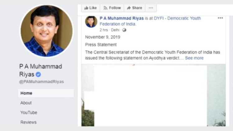 അയോധ്യ വിധി: സമാധാനം പുലരുന്നത് സഖാക്കള്‍ക്ക് സഹിക്കുന്നില്ല; വര്‍ഗീയത ആളിക്കത്തിക്കാന്‍ ഡിവൈഎഫ്‌ഐ നേതാവ് മുഹമ്മദ് റിയാസ്; നിരോധിച്ച തര്‍ക്ക മന്ദിരത്തിന്റെ ദൃശ്യം പോസ്റ്റ് ചെയ്തു