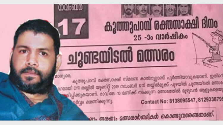 കതിരൂര്: കൂത്തുപറമ്പ് രക്തസാക്ഷി അനുസ്മരണം വളരെയധികം ശ്രദ്ധനേടിയ ഒരു വര്ഷമാണ് ഇത്. കാരണം മറ്റോന്നുമല്ല, പരിപാടിയുടെ ഭാഗമായി ഡിവൈഎഫ്ഐ തയ്യില്മുക്ക് യൂണിറ്റ് സംഘടിപ്പിച്ച ചൂണ്ടയിടല് മത്സരം തന്നെയാണ്. തയ്യില്മുക്ക് പുഴയില് വച്ച് നടത്തിയ മത്സരത്തില് 11 പേര് പങ്കെടുത്തു.