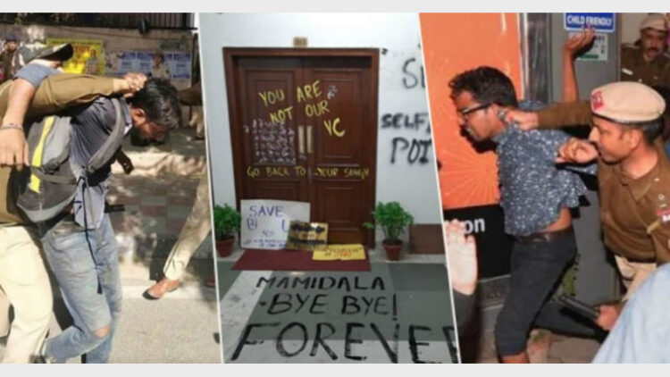 യൂണിയന് പ്രസിഡണ്ട് ഐഷി ഘോഷ് ഉള്പ്പെടെയുള്ളവരെയാണ് കസ്റ്റഡിയിലെടുത്തത്. സര്വ്വകലാശാലയുടെ പ്രധാന കവാടത്തില്നിന്ന് അറുനൂറ് മീറ്റര് അകലെ ബാബാ ഗംഗാനാഥ് മാര്ഗ്ഗിലും ലോധി റോഡില് സഫ്ദര്ജംഗ് ടോംബ്ബിന് സമീപത്തുമായാണ് വിദ്യാര്ത്ഥികളെ തടഞ്ഞത്. പ്രശ്നം പഠിക്കുന്നതിന് കേന്ദ്ര മാനവശേഷി മന്ത്രാലയം മൂന്നംഗ സമിതിയെ നിയോഗിച്ചു. ബന്ധപ്പെട്ടവരുമായി ചര്ച്ച ചെയ്ത് സര്വ്വകലാശാലയുടെ പ്രവര്ത്തനം സാധാരണ നിലയിലാക്കുന്നതിന് ഉന്നതാധികാര സമിതിയെ ചുമതലപ്പെടുത്തിയതായി എംഎച്ച്ആര്ഡി സെക്രട്ടറി ആര്.സുബ്രഹ്മണ്യം പറഞ്ഞു. വിദ്യാര്ത്ഥികളെ മന്ത്രാലയം ചര്ച്ചക്ക് വിളിപ്പിച്ചു. ഫീസ് വര്ദ്ധനവിനെതിരെ ദിവസങ്ങളായി വിദ്യാര്ത്ഥികള് സര്വ്വകലശാലയില് പ്രതിഷേധത്തിലാണ്. വര്ദ്ധനവ് നേരത്തെ ഭാഗികമായി പിന്വലിച്ചിരുന്നു. എന്നാല് പൂര്ണമായും ഒഴിവാക്കണമെന്നാണ് ആവശ്യം.