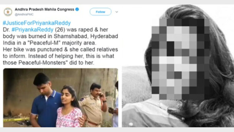 ആന്ധ്രപ്രദേശ് കോണ്ഗ്രസ് മഹിളാ വിഭാഗം ഔദ്യോഗിക ട്വിറ്ററില് നിന്നാണ് ഇത്തരത്തില് ഒരു ട്വീറ്റ് പുറത്തുവിട്ടത്. ട്വീറ്റ് വിവാദമായതോടെ സമൂഹ മാധ്യമങ്ങളിലുടെ നിരവധി പേരാണ് ഇതിനെതിരെ രംഗത്ത് എത്തിയത്. ട്വീറ്റിനെതിരെ റീട്വീറ്റ് ചെയ്യാനും മുസ്ലിമുകള് പ്രതികരിക്കാനും തുടങ്ങിയതോടെ ട്വീറ്റ് പിന്വലിക്കുകയായിരുന്നു. ബുധനാഴ്ച രാത്രിയോടെയാണ് 26കാരിയായ പ്രിയങ്കയ്ക്കു നേരെ അതിദാരുണമായ സംഭവം അരങ്ങേറിയത്.