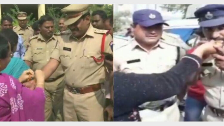 ഹൈദരാബാദ്: വെറ്ററിനറി ഡോക്ടറെ കൊലപ്പെടുത്തിയവരുടെ മരണത്തില്‍ പോലീസിനെ അഭിനന്ദിച്ച് ജനങ്ങള്‍. തെലങ്കാനയിലുടനീളം പോലീസുകാര്‍ക്ക് രാഖി കെട്ടിയും റോസാപ്പൂക്കള്‍ വിതറിയും ഏറ്റുമുട്ടലില്‍ പ്രതികളെ വെടിവച്ച പോലീസുകാര്‍ക്ക് സിന്ദാബാദ് വിളിച്ചും ആഘോഷങ്ങളാരംഭിച്ചു. എല്ലായിടത്തും പോലീസുകാര്‍ക്ക് അഭിനന്ദനപ്രവാഹമാണ്.