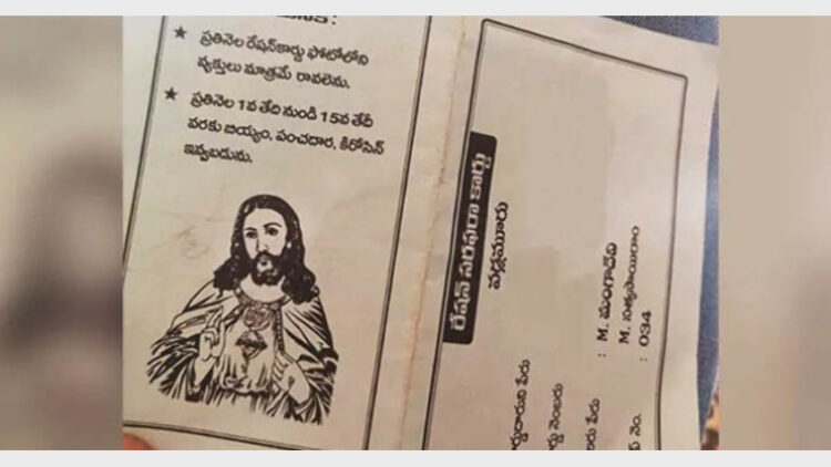 വിശാഖപട്ടണം: യേശുക്രിസ്തുവിന്റെ ചിത്രം പ്രിന്റ് ചെയ്ത റേഷന്കാര്ഡുകള് ആന്ധ്രപ്രദേശിലെ ഗ്രാമങ്ങളില്. റേഷന് കാര്ഡിന്റെ പുറംചട്ടയിലാണ് യേശുക്രിസ്തുവിന്റെ ചിത്രം പതിപ്പിച്ചിരിക്കുന്നത്. മതചിഹ്നങ്ങള് പതിച്ച റേഷന് കാര്ഡുകള് ഒരാള് സോഷ്യല് മീഡിയയില് ഇട്ടതോടെയാണ് ഇവ വ്യാപകമായി പ്രചരിച്ചത്.