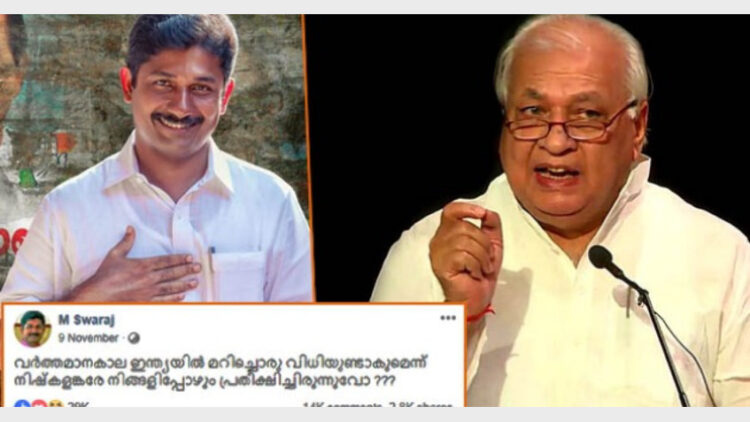 തിരുവനന്തപുരം: അയോധ്യവിധിക്കെതിരെ ഫേസ്‌ബുക്ക് പോസ്റ്റിട്ടതിന് സിപി‌എം എം‌എൽ‌എ എം.സ്വരാജിനെതിരെ നിയമപരമായ നടപടികൾ സ്വീകരിക്കണമെന്ന പരാതിയിന്മേൽ മറുപടി നൽകാൻ സർക്കാരിന് ഗവർണറുടെ നിർദേശം. ഡെപ്യൂട്ടി സെക്രട്ടറിക്കാണ് ഗവർണറുടെ ഡപ്യൂട്ടി സെക്രട്ടറി രേഖാമുലം നിർദേശം നൽകിയത്.