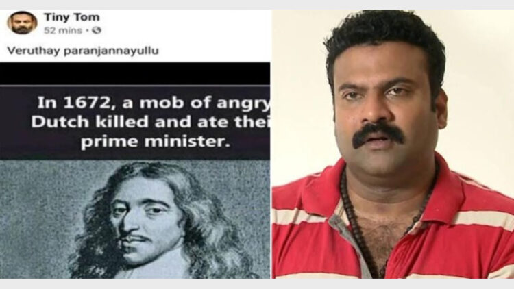 1672ല് കോപാകുലരായ ഒരുകൂട്ടം ആളുകള് അവരുടെ പ്രധാനമന്ത്രിയെ കൊന്നശേഷം ഭക്ഷിച്ചു. എന്നാല് പോസ്റ്റിനെതിരെ നിരവധി പേരാണ് വിമര്ശനവുമായി രംഗത്ത് എത്തിയത്. പ്രതിഷേധം വ്യാപകമായതോടെ ടിനിടോം പോസ്റ്റ് പിന്വലിച്ചിരിക്കുകയാണ്.