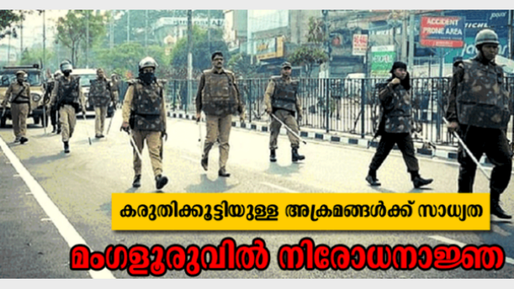 രാത്രി ഒന്പതു മുതല് ഇരുപതാം തീയതി രാത്രി പന്ത്രണ്ട് മണിവരെയാണ് നിരോധനാജ്ഞ. കഴിഞ്ഞ ദിവസങ്ങളിലും ഇന്നുമായി മംഗളൂരുവില് പലയിടത്തും കലാപകാരികള് അക്രമങ്ങള് അഴിച്ചുവിട്ടിരുന്നു . ഇതിന്റെ പശ്ചാത്തലത്തിലാണ് നിരോധനാജ്ഞ.