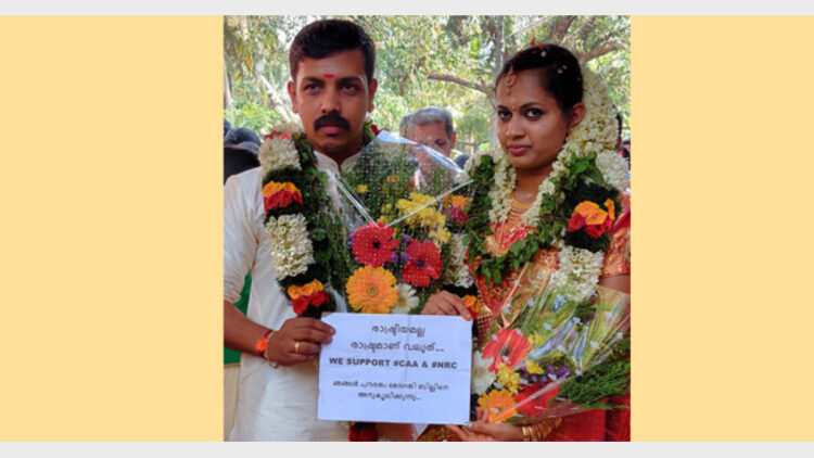 ദേശീയ പൗരത്വ നിയമ ഭേദഗതി: കതിര്‍മണ്ഡപത്തില്‍ നിന്ന് പിന്തുണയറിയിച്ച് നവദമ്പതികള്‍
