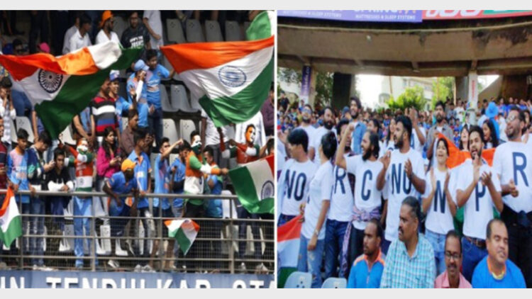 മുംബൈ : ക്രിക്കറ്റ് കളിക്കിടെ പൗരത്വ ഭേദഗതി നിയമത്തിനെതിരെ പ്ലക്കാര്ഡ് ഉയര്ത്തിയ വിദ്യാര്ത്ഥികള്ക്ക് മോദിക്കും സിഎഎയ്ക്കും ജയ് വിളിച്ച് മറുപടി നല്കി മറ്റ് കാണികള്. മുംബൈ വാംഖഡെ സ്റ്റേഡിയത്തില് ഇന്ത്യ- ഓസ്ട്രേലിയ ഏകദിന മത്സരത്തിനിടയിലാണ് ഈ രംഗം അരങ്ങേറിയത്.