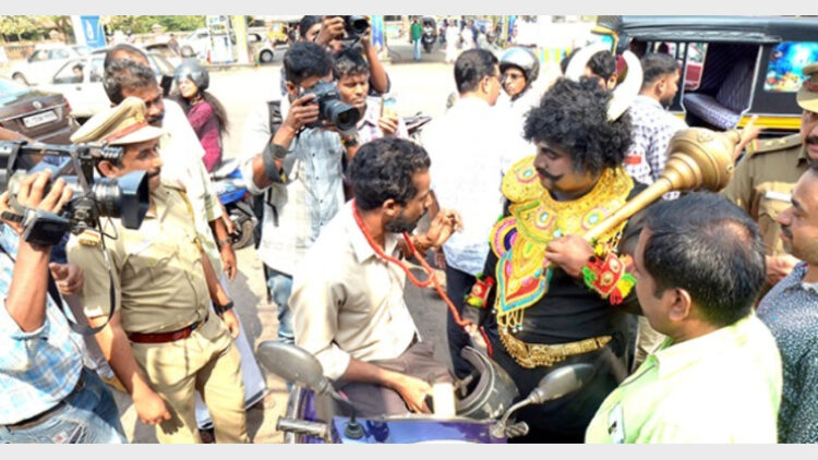 കണ്ണൂര്: ഹെല്മെറ്റ് ധരിക്കാതെ വന്ന ഇരുചക്രവാഹനക്കാരന്റെ കഴുത്തില് ‘കാലന്’ വന്ന് കുരുക്കിട്ടപ്പോള് ആളൊന്ന് ഞെട്ടി. കറുത്തവസ്ത്രവും കൊമ്പും കൈയില് ചുവന്ന കയറും ഗദയും. കണ്ടാല് സാക്ഷാല് കാലന് തന്നെ. ഹെല്മെറ്റും സീറ്റ് ബെല്റ്റുമില്ലാതെ അശ്രദ്ധമായി വണ്ടിയോടിച്ചാല് ഞാന് പിറകെത്തന്നെയുണ്ടാകുമെന്ന് കാലന്റെ മുന്നറിയിപ്പ്. ഒന്നും മനസിലാകാതെ നിന്ന ബൈക്ക് യാത്രികന്റെ അടുത്തേക്ക് പതിയെ ജില്ലാ കളക്ടര് ടി.വി. സുഭാഷും പോലീസും എത്തിയപ്പോഴാണ് കാര്യം പിടികിട്ടിയത്.