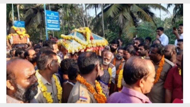 പന്തളം: മകരസംക്രമസന്ധ്യയിൽ ശബരീശ വിഗ്രഹത്തിൽ ചാർത്തിയ തിരുവാഭരണങ്ങളുമായി ഘോഷയാത്രാ സംഘം പന്തളത്ത് മടങ്ങിയെത്തി പുലർച്ചെ ആറന്മുളയിൽ നിന്നുള്ള മടക്കയാത്രയിൽ വഴിയിലുടനീളം ശരണംവിളികളോടെ വരവേൽപ്പ് നൽകി. പന്തളം വലിയ തമ്പുരാന്റെ പ്രതിനിധി പ്രദീപ് കുമാർവർമ്മയും ഗുരുസ്വാമി കുളത്തിനാൽ ഗംഗാധരൻപിള്ളയുടെ നേതൃത്വത്തിലുള്ള സംഘവുമാണ് വെള്ളിയാഴ്ച പന്തളത്ത് മടങ്ങിയെത്തിയത്.