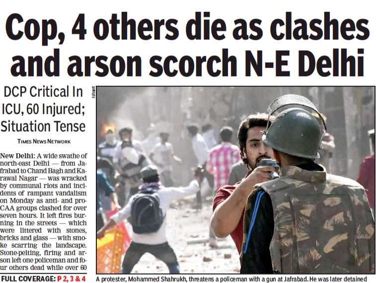 തോക്കുധാരിയായ മുഹമ്മദ് ഷാറൂഖിനെ വെറും പ്രക്ഷോഭകാരിയായി മാത്രമാണ് ടൈം ഓഫ് ഇന്ത്യ ചിത്രീകരിച്ചത്. പോലീസുകാരന് നേരെ തോക്കു ചൂണ്ടി നില്ക്കുന്ന ഇയാളുടെ ചിത്രത്തിന് താഴെ നല്കിയിരിക്കുന്ന ക്യാപ്ഷന് ഇതാണ്. ‘ ജഫ്രാബാദില് പോലീസുകാരനെ തോക്കു ചൂണ്ടി ഭീഷണിപ്പെടുത്തുന്ന പ്രക്ഷോഭകാരികളില് ഒരാളായ മുഹമ്മദ് ഷാറൂഖ്. ഇയാളെ പിന്നീട് അറ്സ്റ്റ് ചെയ്തു’ എന്നായിരുന്നു. ഇയാള് ദല്ഹി പോലീസുകാര്ക്ക് നേരെ എട്ട് തവണ നിറയൊഴിച്ച കാര്യം ടൈംസ് ഓഫ് ഇന്ത്യയുടെ പ്രിന്റ് എഡിഷനില് എവിടേയും പറയുന്നില്ല. ഇന്ത്യാ ടുഡെയും വ്യത്യസ്തമല്ല. മുഹമ്മദ് ഷാറൂഖിനെ പ്രക്ഷോഭകാരിയായിട്ടാണ് ഇവരും ചിത്രീകരിച്ചിരിക്കുന്നത്.