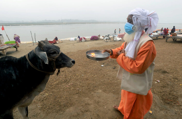 പ്രയാഗയില്‍ ബലിയിടാനും മറ്റും എത്തുന്ന വിരലിലെണ്ണാവുന്നവര്‍മാത്രം. ഒറ്റതിരിഞ്ഞു നടക്കുന്ന പശുക്കള്‍ക്കും മൃഗങ്ങള്‍ക്കും ഭക്ഷണം  സന്യാസിമാര്‍ നല്‍കകുന്നത് കാണാം.