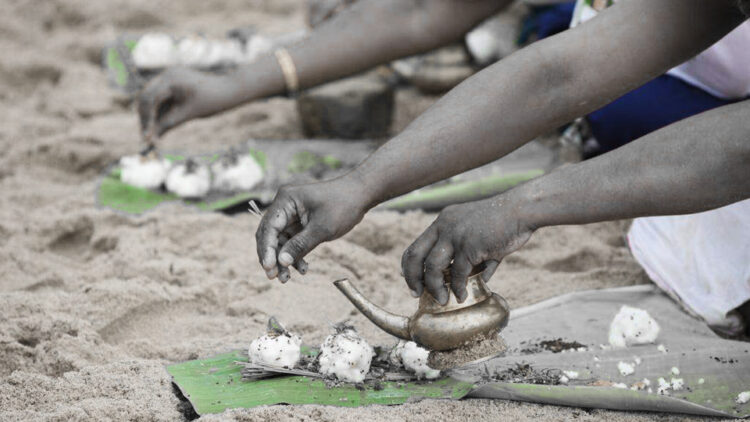 പുണ്യതീര്‍ഥങ്ങളിലാണെങ്കില്‍ നദിയില്‍ പിന്തിരിഞ്ഞു നിന്ന് സമര്‍പണം.