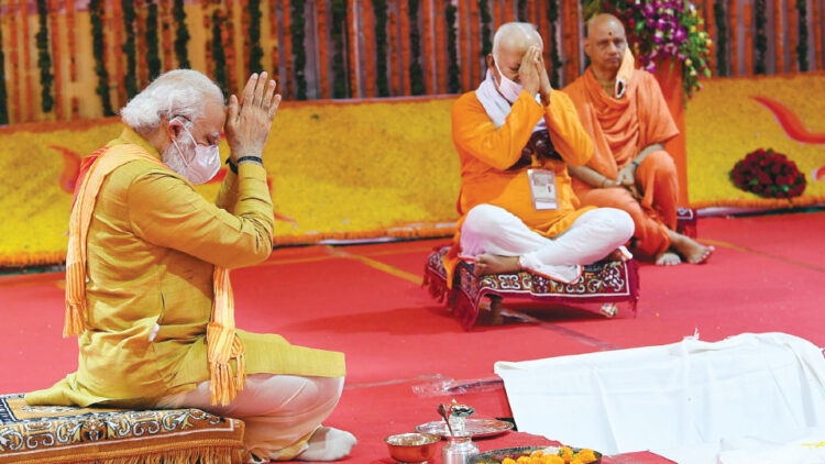 ലോകത്താകമാനമുള്ള രാമഭക്തര്‍ക്ക് വേണ്ടി വെള്ളിയില്‍ തീര്‍ത്ത ശില പാകി രാഷ്‌ട്രനായകന്‍ പ്രധാനമന്ത്രി നരേന്ദ്ര മോദി, അനുഗ്രഹം ചൊരിഞ്ഞ് ആചാര്യവൃന്ദം, സവിശേഷ സാന്നിധ്യമായി ആര്‍എസ്എസ് സര്‍സംഘചാലക് ഡോ. മോഹന്‍ ഭാഗവത്.