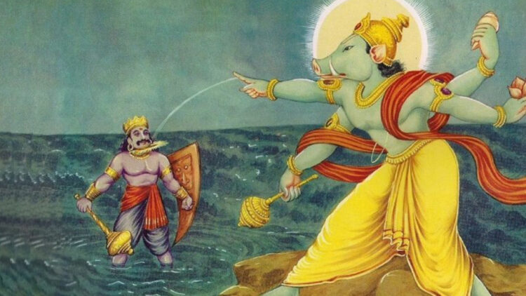 ഹിരണ്യാക്ഷന്‍ കോപാകുലനായി. സുരാധമ! കാട്ടുമൃഗമേ! എന്നിങ്ങനെ ശകാരവാക്കുകളാല്‍ വരാഹമൂര്‍ത്തിയെ പ്രകോപിപ്പിക്കാന്‍ ശ്രമിച്ചു. ഭഗവാനും ഹിരണ്യാക്ഷനും പര്‍വതരൂപികളാണ്. കാഴ്ചയില്‍ തുല്യബലവാന്മാര്‍ തന്നെ. ഹിരണ്യാക്ഷന്‍ ഗദകൊണ്ട് ഭഗവാനെ അടിച്ചു. വരാഹം ഒഴിഞ്ഞുമാറി അടി തടുത്തു. ഭഗവാന്‍ തിരിച്ചും ഒന്നു പ്രഹരിച്ചു. ഹിരണ്യാക്ഷന്‍ അതിനെ ഗദകൊണ്ടു തടുത്തു. ദ്വന്ദ്വയുദ്ധം പിരിമുറുകി.
