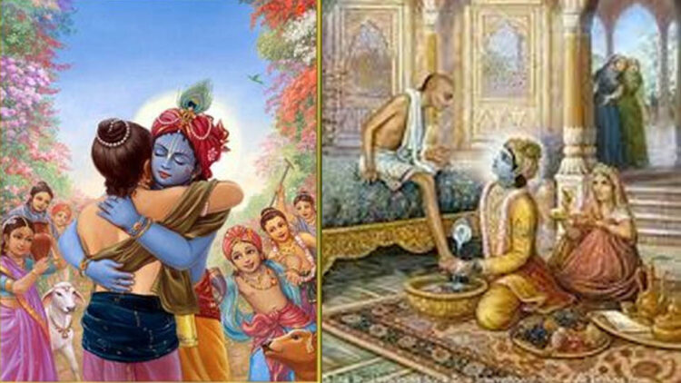 കൃഷ്ണന് സുദാമാവിന്റെ കൈപിടിച്ചു കൊട്ടാരവാതില്ക്കലെത്തിച്ചു. അവിടെ ലക്ഷ്മീഭഗവതി ഒരു കൂജ വെള്ളവുമായി കാത്തുനില്ക്കുന്നു. കൃഷ്ണന് കുചേലന്റെ കാലില് വെള്ളമൊഴിച്ചു. രുക്മിണി ഒരു പട്ടു തുണികൊണ്ടു തുടച്ചു. പാദതീര്ത്ഥം രണ്ടുപേരും ശിരസ്സിലണിഞ്ഞു.