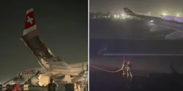 ഡൽഹി എയർപോർട്ടിൽ സ്വിസ് എയർ വിമാനത്തിന് തീപിടിച്ച് 6 പേർക്ക് പരിക്ക്, യാത്രക്കാരെ എമർജൻസി സ്ലൈഡിലൂടെ ഒഴിപ്പിച്ചു