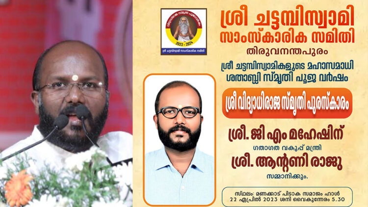 തിരുവനന്തപുരം: സാംസ്കാരിക ആദ്ധ്യാത്മിക സാമൂഹ്യ മേഖലയിലെ സമഗ്രസംഭാവനയ്ക്കാണ് ശ്രീവിദ്യാധിരാജ സ്മൃതി പുരസ്കാരം ജി.എം മഹേഷിന് ഇന്ന് സമ്മാനിക്കും. ചട്ടമ്പി സ്വാമിയുടെ മഹാസമാധി സ്മൃതി പൂജാ വര്ഷാചരണത്തിന്റെ ഭാഗമായി ചട്ടമ്പിസ്വാമി സ്മാരക സമിതിയാണ് അവര്ഡ് ഏര്പ്പെടുത്തിയത്. മണക്കാട് പട്ടിക സമാജം ഹാളില് 5.30 ന് നടക്കുന്ന ചടങ്ങില് മന്ത്രി ആന്റണി രാജു സമ്മാനിക്കും