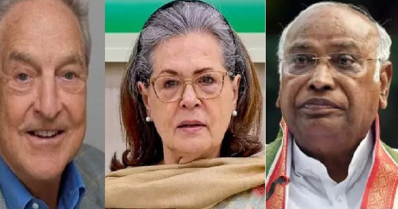 അമേരിക്കന് ശതകോടീശ്വരന് ജോര്ജ്ജ് സോറോസ്, (ഇടത്ത്) സോണിയാഗാന്ധി (നടുവില്) മല്ലികാര്ജുന് ഖാര്ഗെ (വലത്ത്)
