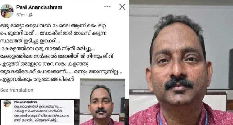 കാസർകോട്: അഹമ്മദാബാദ് എയർ ഇന്ത്യാ വിമാനാപകടത്തിൽ മരിച്ച മലയാളി നേഴ്സ് രഞ്ജിത ആർ നായരെ അധിക്ഷേപിച്ച് ഡെപ്യൂട്ടി തഹസിൽദാർ . കാഞ്ഞങ്ങാട് വെള്ളരിക്കുണ്ട് ഡെപ്യൂട്ടി തഹസിൽദാർ പവിത്രനാണ് രഞ്ജിതയെയും നായർ സമുദായത്തെയും അപമാനിച്ച് ഫേസ്ബുക്ക് പോസ്റ്റ് പങ്ക് വച്ചത് . ‘Pavi Anandashram’ എന്ന പേരിലാണ് ഫേസ്ബുക്ക് പ്രൊഫൈൽ.