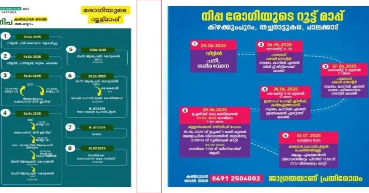 പാലക്കാട്ടെ രോഗിയുടെ റൂട്ട് മാപ്പ് പ്രസിദ്ധീകരിച്ചു. സ്ഥിരീകരണം വരും മുമ്പ് തന്നെ പ്രോട്ടോകോള് പ്രകാരം പ്രതിരോധ നടപടികള് ശക്തമാക്കിയിരുന്നു. രണ്ട് നിപ കേസുകളുമായി ബന്ധപ്പെട്ട് കോഴിക്കോട്, മലപ്പുറം, പാലക്കാട് ജില്ലകളില് ജാഗ്രതാ നിര്ദേശം നല്കി.