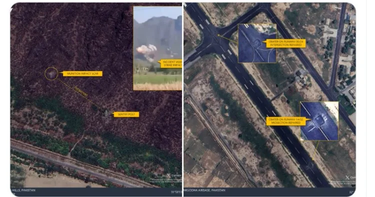 2025 ജൂണിൽ പകർത്തിയ ഗൂഗിൾ എർത്തിൽ നിന്നുള്ളതാണ് പുതിയ ചിത്രങ്ങൾ. പാകിസ്ഥാനിലെ സർഗോധ ജില്ലയിലെ കിരാന കുന്നുകളിലെ സ്ഥലമാണ് ദൃശ്യത്തിൽ. ഡാറ്റ വിശകലനം ചെയ്ത സൈമൺ, സംശയിക്കപ്പെടുന്ന ആക്രമണ സ്ഥലത്ത് ദൃശ്യമായ നാശനഷ്ടങ്ങൾ ചൂണ്ടിക്കാണിക്കുന്നുമുണ്ട്. സമീപത്തുള്ള സർഗോധ വ്യോമതാവളത്തിലെ അടുത്തിടെ നന്നാക്കിയ റൺവേകളുടെ അടയാളങ്ങളും അദ്ദേഹം പ്രത്യേകം സൂചിപ്പിക്കുന്നുണ്ട്, ഇത് ഓപ്പറേഷനിൽ കേടുപാടുകൾ സംഭവിച്ചതായാണ് സൈമണിന്റെ വിവരണം.