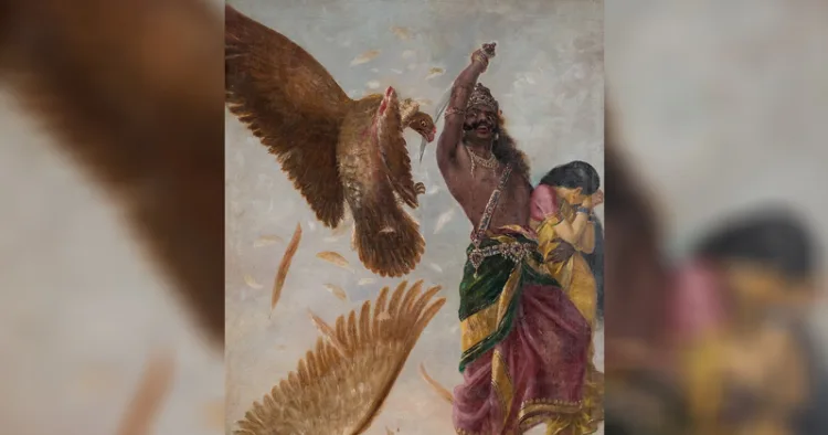 രാമന്റെ സുഹൃത്തായ ജടായു രാവണൻ സീതയെ തട്ടിക്കൊണ്ടുപോകുന്ന ആ ദയനീയമായ കാഴ്ച കണ്ടു. വയസ്സനാണെങ്കിലും ആ കഴുകൻ തന്റെ ശക്തിമുഴുവൻ സംഭരിച്ചു പറന്നുചെന്ന് രാവണനെ ആക്രമിച്ചു. ആകാശരഥം തകർത്ത് അവന്റെ ദേഹത്തെ ഗുരുതരമായി വ്രണപ്പെടുത്തി. പക്ഷേ പെട്ടെന്ന് രാവണൻ തന്റെ ചന്ദ്രഹാസമെന്ന വാൾ വീശി ജടായുവിന്റെ ചിറകുകൾ മുറിച്ച്, നിലത്തിട്ടു. ദേഹം മുഴുവനും വ്രണങ്ങളുമായി ജടായു വനത്തിൽ വേദനയോടെ വീണുകിടന്നു. രാവണൻ മറ്റൊരാകാശരഥം തന്റെ മായാവിദ്യയാൽ വിളിച്ച് വരുത്തി ലങ്കയിലേക്കുള്ള യാത്ര തുടർന്നു. സീത കരഞ്ഞു കണ്ണീർ വാർത്തുകൊണ്ട് നിസ്സഹായയായി രഥത്തിലിരുന്നു