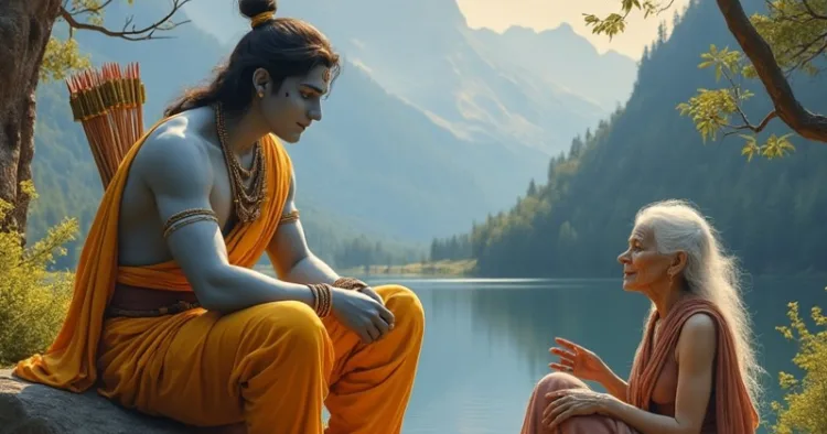 രാമവും ലക്ഷ്മണനും ശബരിയുടെ ആശ്രമത്തിലേക്ക് പുറപ്പെട്ടു. അവിടെ, രാമഭക്തയായ ശബരി, കണ്ണീർ ചൊരിഞ്ഞ്, അതീവസന്തോഷത്തോടെ ഫലമൂലാദികൾ കൊണ്ടുവന്ന് അവരെ സ്വാഗതം ചെയ്തു സൽക്കരിച്ചു. കാട്ടുജാതിക്കാരിയായിരുന്നിട്ടും വനത്തിൽ തപസ്സുചെയ്യുന്ന ഋഷിമാരെ സേവിക്കാൻ അവൾ ജീവിതം മുഴുവനും ചിലവഴിച്ചുവന്നു. അവളുടെ ഭക്തിയിൽ സന്തുഷ്ടരായ ഋഷിമാർ, ശ്രീരാമനെ നേരിട്ട് കാണുവാനിടയാകുമ്പോൾ അവളുടെ ജീവിതലക്ഷ്യം പൂർത്തിയാകുമെന്ന് അനുഗ്രഹിച്ച് ഉറപ്പ് നല്കിയിരുന്നു. ഇപ്പോൾ, രാമന്റെ ദിവ്യസാന്നിദ്ധ്യത്തിൽ അവൾ ഏറെ ആഹ്ലാദിച്ചു. ഭക്തിയില്ലെങ്കിൽ ഒരുവന്റെ ഉന്നതകുലജന്മമോ, പണ്ഡിത്യമോ, ആചാരങ്ങളോ ഒന്നും തന്നെ ഭഗവദ് പ്രസാദം  ലഭിക്കാൻ ഉത്തകുകയില്ലതന്നെ.