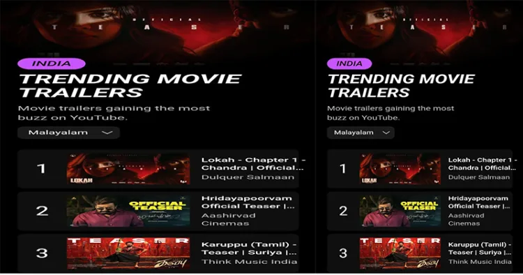 ടീസർ റിലീസിന് പിന്നാലെ വലിയ ഹൈപ്പാണ് ചിത്രത്തിന് മേൽ ഉണ്ടായിരിക്കുന്നത്. ലോകമെമ്പാടും ട്രെൻഡിങ്ങ് ലിസ്റ്റിൽ ഇടം പിടിച്ച ലോക ചാപ്റ്റർ 1 : ചന്ദ്രയുടെ ട്രെയിലർ ഇന്ത്യയിൽ തന്നെ സിനിമകളുടെ ട്രെയിലർ ട്രെൻഡിങ്ങ് ലിസ്റ്റിലാണ് ഒന്നാം സ്ഥാനം നേടിയത്. ബഹ്റൈനിൽ ഒന്നാം സ്ഥാനത്താണ് ടീസർ. ലിസ്റ്റിൽ മൂന്നാം സ്ഥാനത്തും ഓസ്ട്രേലിയയിൽ 25ാം സ്ഥാനത്തും ടീസർ ഇടം പിടിച്ചു. ട്രെയിലർ കണ്ട് തീയറ്ററിൽ ചിത്രത്തിനായി ഒരുപാട് പ്രതീക്ഷയോടെ കാത്തിരിക്കുകയാണ് സിനിമ പ്രേമികൾ.