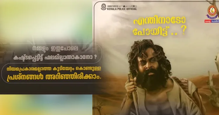 മാധവ് സുരേഷിന്റെ കുമ്മാട്ടിക്കളി എന്ന ചിത്രത്തിലെ ‘എന്തിനാട് കൊന്നിട്ട്’, ‘നമ്മൾ അനാഥരാണ് ഗുണ്ടകളല്ല’ തുടങ്ങിയ ഡയലോഗുകൾ സോഷ്യൽ മീഡിയയിലടക്കം നിരവധി ട്രോളുകൾ ഏറ്റുവാങ്ങിയിരുന്നു. ഇതിനെ ഓർമ്മിപ്പിക്കുന്ന തരത്തിലെ വാചകങ്ങളിലാണ് നിയമപ്രകാരമല്ലാത്ത കുടിയേറ്റങ്ങൾ കൊണ്ടുണ്ടാകുന്ന പ്രശ്നങ്ങളെക്കുറിച്ച് പറയുന്ന കേരള പോലീസിന്റെ ഫേസ്ബുക്ക് പോസ്റ്റ് ആരംഭിക്കുന്നത്. ആടുജീവിതത്തിലെ പൃഥ്വിരാജിന്റെ കഥാപാത്രത്തിന്റെ ചിത്രവും പോസ്റ്റിനൊപ്പമുണ്ട്.
