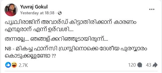 എമ്പുരാന് എന്ന സിനിമ ഗുജറാത്ത് കലാപത്തിന്റെ പേരില് ഹിന്ദുസമുദായത്തെ ഏകപക്ഷീയമായി വിമര്ശിക്കുന്ന ഒന്നായിരുന്നു. ഇതിന്റെ സംവിധായകന് പൃഥ്വിരാജായിരുന്നു. ഇതാണ് അവാര്ഡ് ലഭിക്കാതിരിക്കാന് കാരണമായതെന്നാണ് നടി ഉര്വ്വശി പറഞ്ഞതിനര്ത്ഥം. ഉര്വ്വശിയുടെ പ്രതികരണത്തിന് യുവ ബിജെപി നേതാവ് യുവരാജ് ഗോകുല് നല്കിയ മറുപടി വൈറലായി ഫെയ്സ് ബുക്കില് പ്രചരിക്കുകയാണ്. ‘ഞങ്ങള്ക്ക് അറിഞ്ഞുകൂടായിരുന്നു’, എന്നായിരുന്നു യുവരാജ് ഗോകുല് നടത്തിയ പ്രതികരണം.