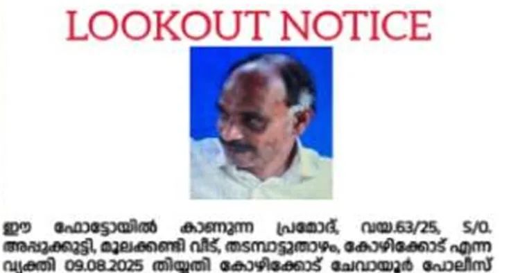 തുടര്‍ന്ന് ചേവായൂര്‍ പൊലീസ് ഞായറാഴ്ച രാവിലെയാണ് പ്രമോദിനായി ലുക്ക് ഔട്ട് നോട്ടീസ് പുറത്തിറക്കിയത്.