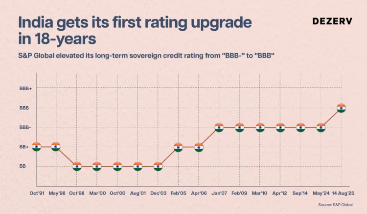 പ്രമുഖ അമേരിക്കൻ ക്രെഡിറ്റ് റേറ്റിങ് ഏജൻസിയായ എസ് ആൻഡ് പി ഗ്ലോബൽ ഇന്ത്യയുടെ സോവറീൻ ക്രെഡിറ്റ് റേറ്റിങ് BBB നെഗറ്റീവ് നിലയിൽ നിന്ന് BBB ആയി ഉയർത്തി. രാജ്യത്തിന്റെ സാമ്പത്തിക സ്ഥിരത, വളർച്ചാ സാധ്യതകൾ, വിദേശ നിക്ഷേപ സൗഹൃദ അന്തരീക്ഷം എന്നിവയാണ് ഈ ഉയർച്ചയ്‌ക്കു പിന്നിൽ എസ് ആൻഡ് പി ഗ്ലോബൽ ചൂണ്ടിക്കാണിക്കുന്നത്.