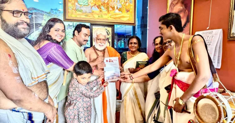 തൃശ്ശൂര്: വിനായക ചതുര്ത്ഥിയോടനുബന്ധിച്ച് നടക്കുന്ന തിരുവുത്സവത്തില് സോപാനസംഗീതം അവതരിപ്പിച്ച ഏലൂര് ബിജുവിന്റെ ശിഷ്യരായ ലത. വി, കമല ആനന്ദ്, ജിഷ ഉഷാര്, കാവ്യ അരുണ്കുമാര്, പരമേശ്വരന് നമ്പൂതിരിപ്പാട്, സംഘാടകന് ബാലു ബാഹുലേയന് എന്നിവര് മേല്ശാന്തി പരമേശ്വരന് നമ്പൂതിരിയില് നിന്ന് സര്ട്ടിഫിക്കറ്റ് ഏറ്റുവാങ്ങുന്നു.
