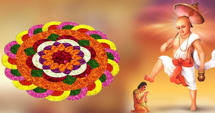 മഹാവിഷ്ണുവിന്റെ അവതാരമായ വാമനന്, ചക്രവര്ത്തിയായിരുന്ന മഹാബലിയെ സുതലത്തിലേക്ക് ഉയര്ത്തി. അവിടെ നിന്നും തന്റെ പ്രജകളെ കാണാന് വര്ഷത്തില് ഒരു ദിവസം ഭൂമിയിലേക്ക് എഴുന്നെള്ളാന് ചക്രവര്ത്തിക്ക് വാമനന് അനുമതിയും നല്കി. അതിന് പ്രകാരം ചിങ്ങമാസത്തിലെ തിരുവോണം നാളില് പ്രജകളെ കാണാന് എഴുന്നെള്ളുന്ന മാവേലിയെ സ്വീകരിക്കാന് ആണേ്രത പൂക്കളം ഒരുക്കുന്നത്.