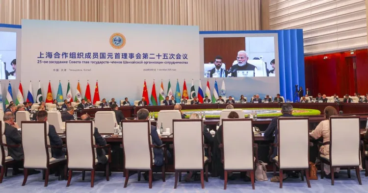 പഹൽഗാം ഭീകരാക്രമണത്തെ സ്പോൺസർ ചെയ്തവരെ നിയമത്തിനു മുന്നിൽ കൊണ്ടു വരണം ഭീകരവാദത്തിൻറെ കാര്യത്തിൽ ഇരട്ടത്താപ്പ് പാടില്ല ഭീകരവാദത്തെയും മതമൗലികവാദത്തെയും ശക്തമായി ചെറുക്കുമെന്നും ഇന്ത്യ, പാകിസ്ഥാൻ, റഷ്യ എന്നിവയുൾപ്പെടെ എല്ലാ അംഗങ്ങളും ഒപ്പുവെച്ച് അംഗീകരിച്ച ടിയാൻജിൻ പ്രഖ്യാപനം.