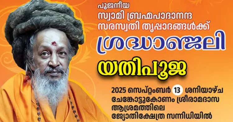 തിരുവനന്തപുരം: ശ്രീരാമദാസമിഷന് പ്രസ്ഥാനങ്ങളുടെ മുന് അധ്യക്ഷനായിരുന്ന സ്വാമി ബ്രഹ്മപാദാനന്ദ സരസ്വതി തൃപ്പാദങ്ങള്ക്ക് ശ്രദ്ധാഞ്ജലി അര്പ്പിച്ചുകൊണ്ടുള്ള അനുസ്മരണ സമ്മേളനവും യതിപൂജയും ചേങ്കോട്ടുകോണം ശ്രീരാമദാസ ആശ്രമത്തിലെ ജ്യോതിക്ഷേത്ര സന്നിധിയില് 13ന് നടക്കും. രാവിലെ 10 ന് ശ്രീരാമദാസമിഷന് അധ്യക്ഷന് ശ്രീശക്തി ശാന്താനന്ദ മഹര്ഷിയുടെ അധ്യക്ഷതയില് ചേരുന്ന അനുസ്മരണ സമ്മേളനത്തിന്റെ ദീപപ്രോജ്ജ്വലനം തിരുവിതാംകൂര് രാജകുടുംബാംഗം അവിട്ടം തിരുനാള് ആദിത്യവര്മ്മ നിര്വഹിക്കും. സമ്മേളനത്തിന്റെ ഉദ്ഘാടനം മുന്കേന്ദ്രമന്ത്രി വി.മുരളീധരന് നിര്വഹിക്കും.