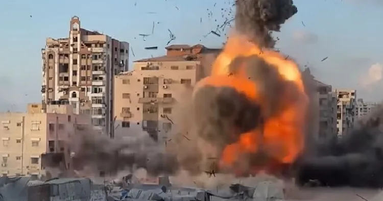 മൂന്ന് ടവറുകളുള്ള ഗാസയിലെ അല് റോയ ടവര് ഇസ്രയേല് ബോംബിട്ട് തകര്ക്കുന്നതിന്റെ വീഡിയോ ദൃശ്യം: