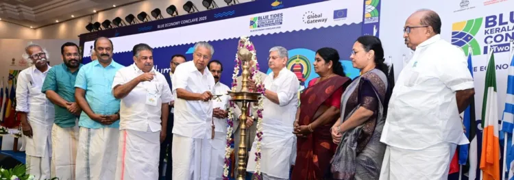 യൂറോപ്യൻ യൂണിയൻ, കേന്ദ്ര സർക്കാർ, സംസ്ഥാന സർക്കാർ സംയുക്തമായി ഇന്നും നാളെയും കോവളത്തു നടത്തുന്ന ‘ബ്ലൂ ടൈഡ്’ കോൺക്ലേവിന്റെ ഉദ്ഘാടനം മുഖ്യമന്ത്രി പിണറായി വിജയൻ നിർവഹിക്കുന്നു. കേന്ദ്ര ഫിഷറീസ് വകുപ്പുമന്ത്രി രാജീവ് രഞ്ജൻ സിങ്, കേന്ദ്ര മന്ത്രി ജോർജ് കുര്യൻ, സംസ്ഥാന മന്ത്രിമാരായ കടന്നപ്പള്ളി രാമചന്ദ്രൻ, കെ.രാജൻ, കെ.എൻ. ബാലഗോപാൽ, ചിഞ്ചുറാണി, വീണ ജോർജ്ജ്, കേരള സർക്കാരിന്റെ ന്യൂദൽഹിയിലെ പ്രതിനിധി കെ.വി. തോമസ് എന്നിവർ സമീപം.