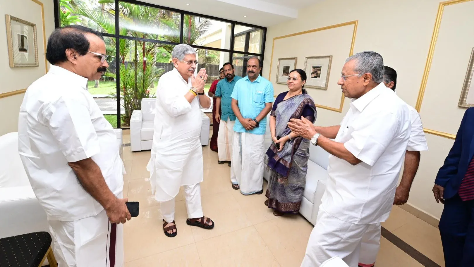 കോവളത്ത് നടന്ന ‘ബ്ലൂ ടൈഡ്സ്’ രാജ്യാന്തര കോൺക്ലേവിൽ പങ്കെടുക്കാനെത്തിയ കേന്ദ്ര ഫിഷറീസ് വകുപ്പുമന്ത്രി രാജീവ് രഞ്ജൻ സിങ്, സഹമന്ത്രി ജോർജ്ജ് കുര്യൻ എന്നിവരെ മുഖ്യമന്ത്രി പിണറായി വിജയൻ സ്വാഗതം ചെയ്യുന്നു. സംസ്ഥാന മന്ത്രിമാരായ വീണ ജോർജ്ജ്, കെ.എൻ. ബാലഗോപാൽ, കെ. രാജൻ സമീപം.