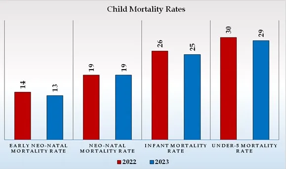 സാമ്പിൾ രജിസ്‌ട്രേഷൻ സംവിധാനം (എസ്ആർഎസ്) സ്ഥിതിവിവരകണക്ക് റിപ്പോർട്ട് 2023 പ്രകാരം, അഞ്ച് വയസ്സിന് താഴെയുള്ള കുട്ടികളുടെ മരണനിരക്ക് 29 ആയി കണക്കാക്കപ്പെടുന്നു. 2022ൽ ഈ നിരക്ക് 30 ആയിരുന്നു. ഗ്രാമപ്രദേശങ്ങളിൽ ഇത് 33 ഉം, നഗരപ്രദേശങ്ങളിൽ 20 ഉം ആണ്.